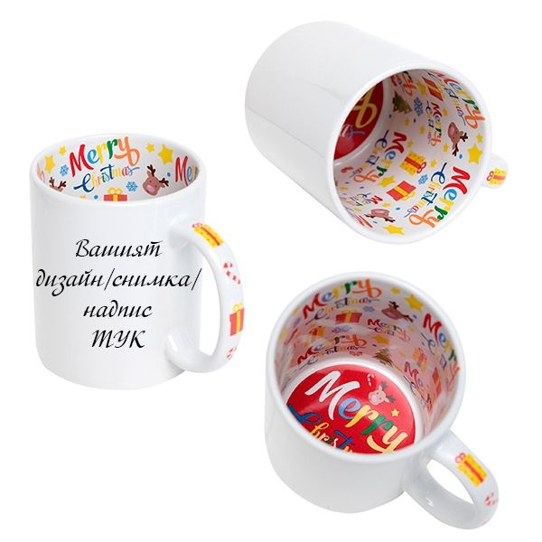Чаша в цветна вътрешност и дръжка MERRY CHRISTMAS, която се изработва с Ваша снимка, надпис, картинка, лого!